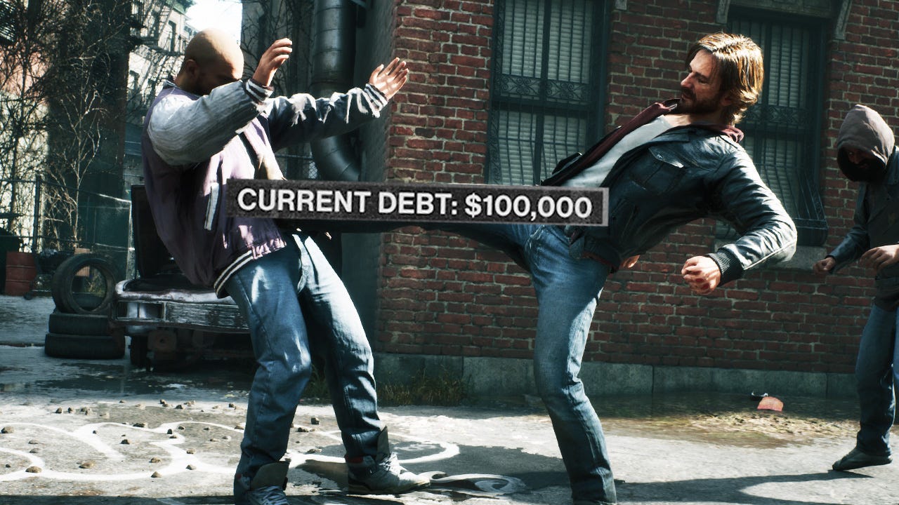For a start, it’s not a power fantasy, eschewing the traditional petty criminal rags-to-underworld-kingpin-riches story for the oppressive conception of insurmountable debt. Following a botched job in another city, protagonist Samson McCray is saddled with $100,000 to pay off via odd jobs. Strict daily targets must be adhered to or the bailiffs are sent round to give you a kicking. Fail to raise cash quickly enough and you pay in blood: your sister is being held hostage by the St. Louis shellsuit mafia as collateral. And has apparently also been roped into doing their bookkeeping.
